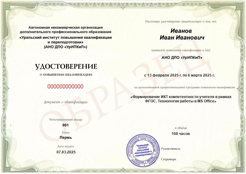 - Образец удостоверения о повышении квалификации.