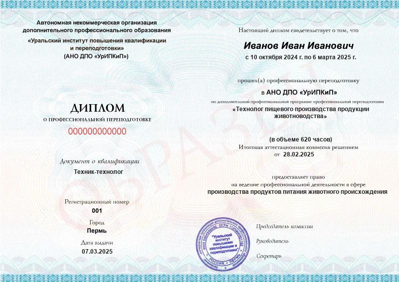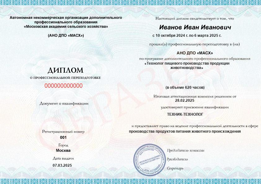 Технолог пищевого производства продукции животноводства (620ч)